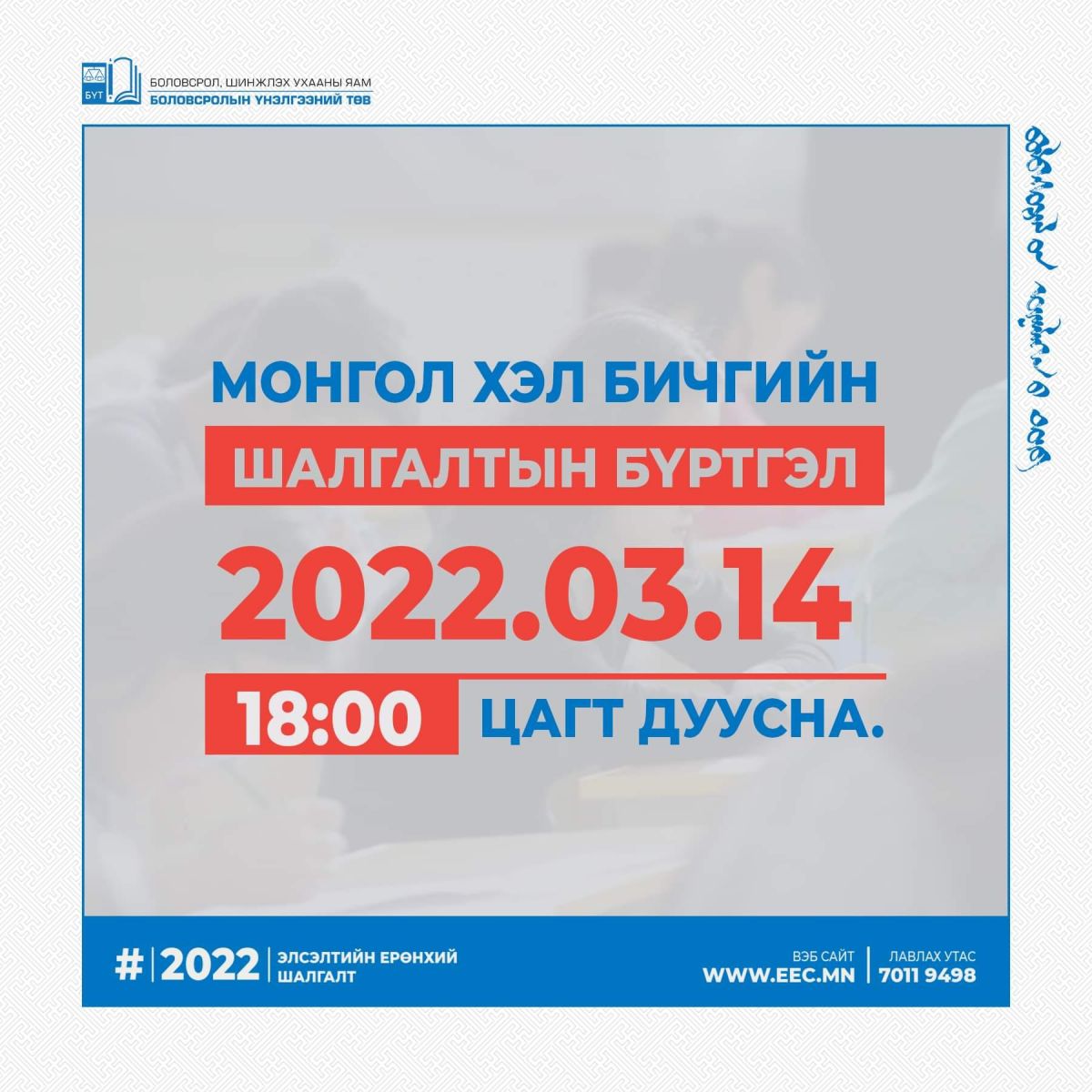 Монгол хэл бичгийн шалгалтыг Улаанбаатар хотын цагаар 2022 оны 04 сарын 02-ны өдөр зохион байгуулна. Монгол хэл бичгийн шалгалтын босго оноо 400 байх аж.