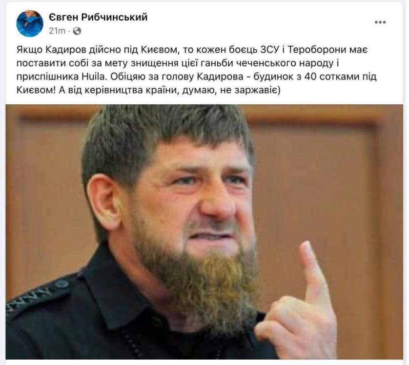 Ингээд Украинд Кадыровыг агнах ан эхэлсэн гэхэд болох юм. Украины парламентын депутат асан Евгений Рыбчинский Рамзаны хаана байгааг мэдэж байгаа хүн байвал даруй мэдэгдэхийг хүсээд Украины Зэвсэгт хүчний бүх дайчин түүнийг устгахыг зорилго болгох хэрэгтэй гэж зарлалаа. Мөн Кадыровын толгойг авчирсан өөрөөр хэлбэл устгасан хүнд Киевт орон сууц, 40 га газар амласан байна.