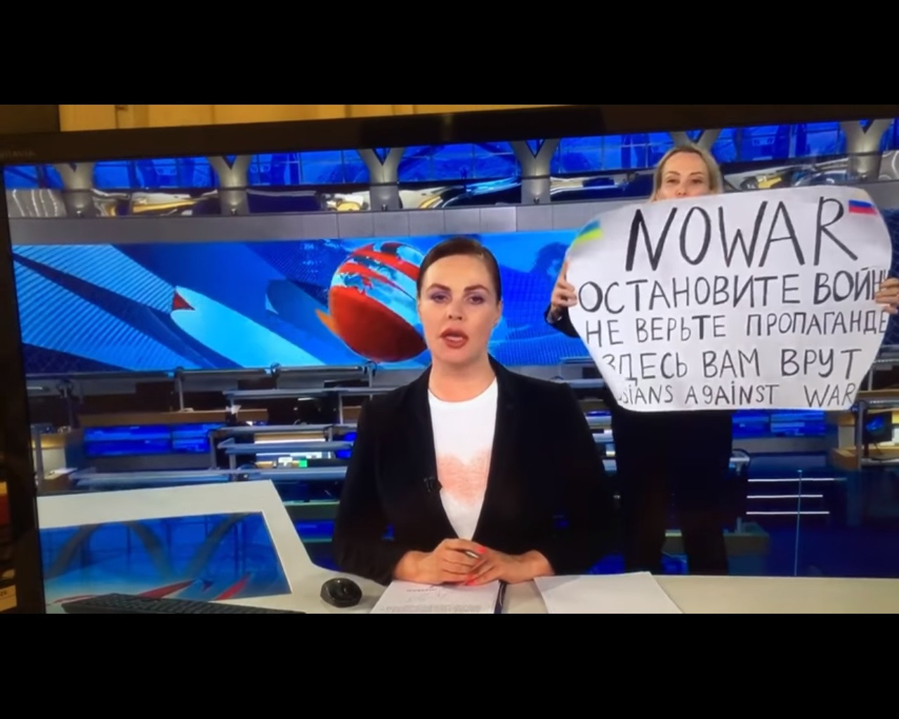 Хөтлөгч ОХУ-ын Ерөнхий сайд Михаил Мишустины олон улсын хориг арга хэмжээний үр нөлөөг багасгах төлөвлөгөөний талаарх мэдээ уншиж байх үед “Дайнаа зогсоо. Ухуулагт бүү итгэ. Энд та нарт худал ярьж байна. Оросууд дайны эсрэг. Дайнд үгүй. Дайнаа зогсоо” гэсэн бичиг бүхий зурагт хуудас барьсан эмэгтэй гэнэт гарч иржээ.