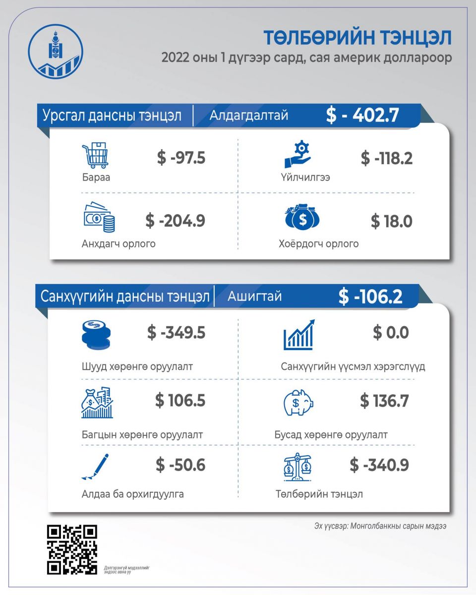 Үндэсний статистикийн хорооны мэдээллээр төлбөрийн тэнцлийн урсгал данс 2022 оны нэгдүгээр сард 402.7 сая ам.долларын алдагдалтай гарч, алдагдал өмнөх оны мөн үеэс 350.7 сая ам.доллароор буюу 7.7 дахин өсжээ.