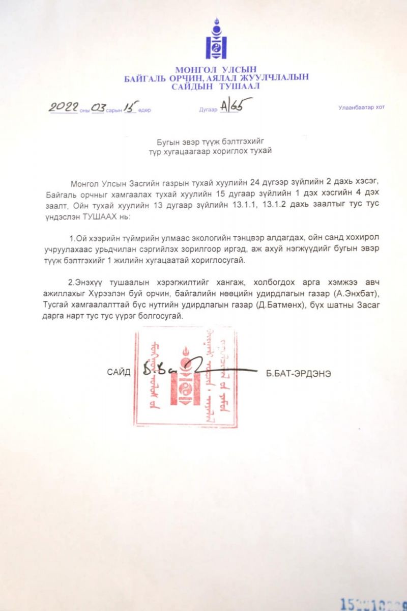 Мөн тушаалын хэрэгжилтийг хангаж, холбогдох арга хэмжээ авч ажиллахыг БОАЖЯ-ны Хүрээлэн буй орчин, байгалийн нөөцийн удирдлагын газар, Тусгай хамгаалалттай бүс нутгийн удирдлагын газарт, бүх шатны Засаг дарга нарт тус тус үүрэг болгосон байна.