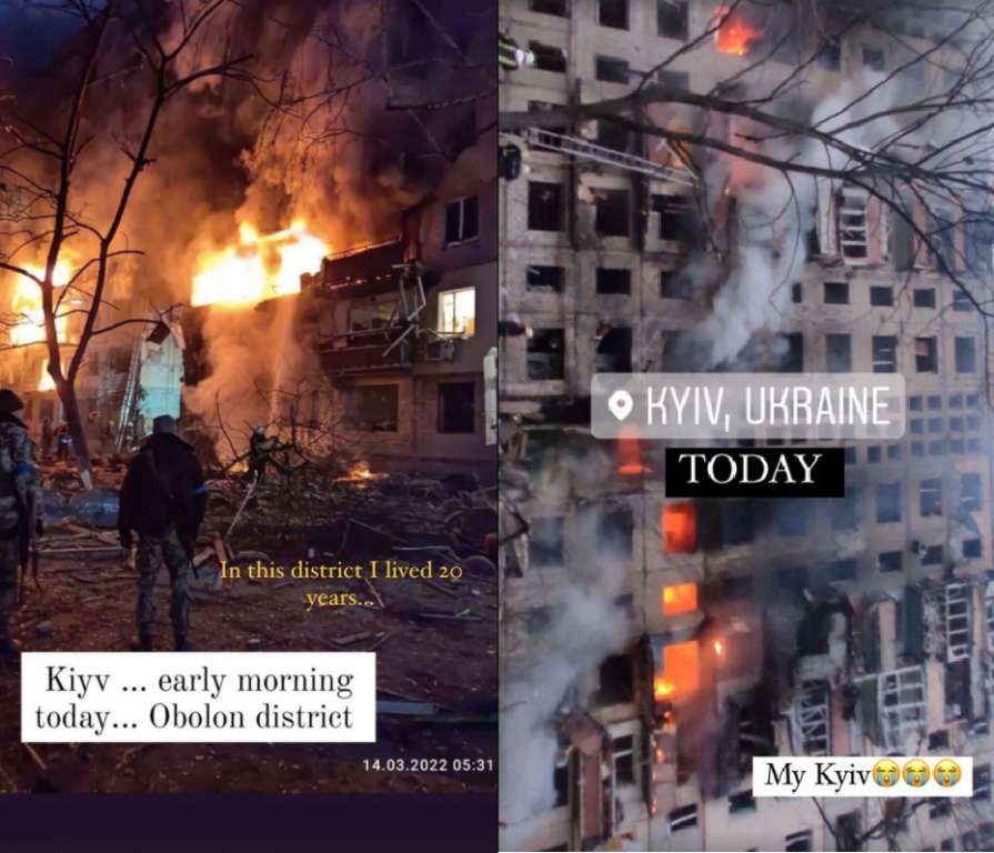 Дарья саяхан инстаграмдаа Киев хотын бөмбөгдөлтөд өртсөн зургийг оруулж, “Энэ Оболон дүүрэгт би өссөн. 20 жил амьдарсан. Алуурчид аа, энэ бүхний төлөөс та нарт 10 дахин хүнд тусаасай” гэж бичсэн байлаа.