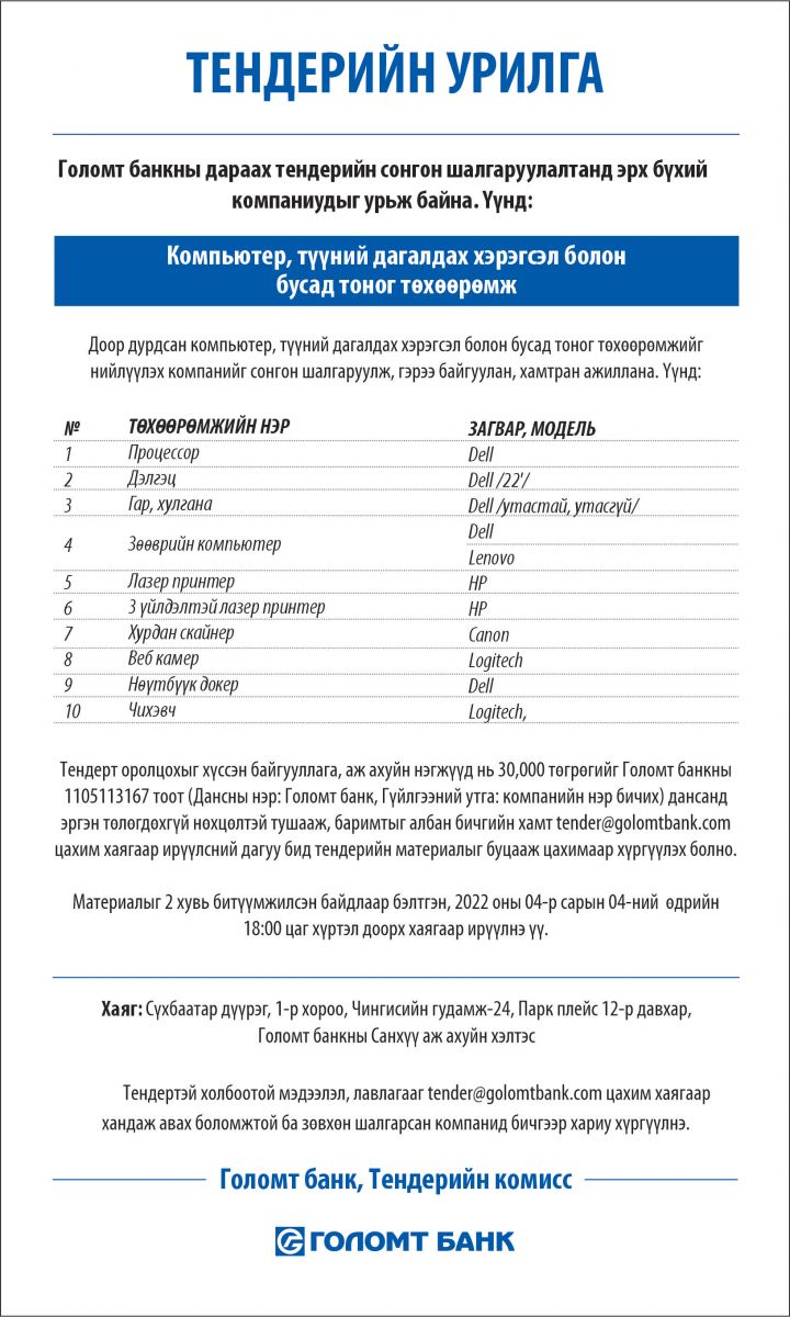 Голомт банкнаас дараах тендерийн сонгон шалгаруулалтыг зарлаж байна. Компьютер, түүний дагалдах хэрэгсэл болон бусад тоног төхөөрөмжийг нийлүүлэх компанийг сонгон шалгаруулж, хамтран ажиллана.