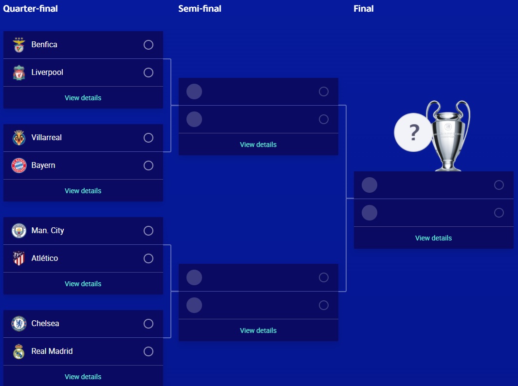1/4 финалын эхний тоглолтууд дөрөвдүгээр сарын 5-6, хариу тоглолтууд дөрөвдүгээр сарын 12-13-нд явагдаж, хагас шигшээ тоглолт дөрөвдүгээр сарын 26-27, тавдугаар сарын 3-4-нд болно.