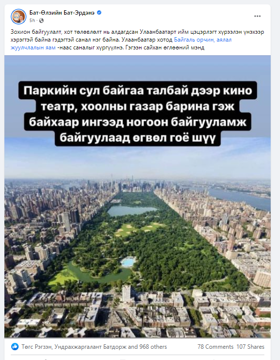 Хашаа барьж байхаар орчныг зүлэгжүүлэх,мод барих, ногоон байгууламж байгуулж байгаа нь зөв бна. Энд Туул-Яармагийн гүүрнээс хот явах замд төмөр хашаагаар битүүлсэн газрын бут, модыг сүйтгэн барилга байгууламж барьж байгааг анхаармаар бна. Одоо урин дулааны цаг болж барилга барих ажил нь эхлэж бгаа бололтой. Энд анхаарлаа хандуулна уу. Тэр хэсгийг тохижуулж амрах орчныг бий болгомоор санагдана. Энэ нь Бетон зуурмагийн үйлдвэр болон ТЭЦ-Ш-н зүгээс гардаг утаа болон нүүрсний үүрмэг хог салхиар туугдан тэр хавиар хийсч оршин суугчдын эрүүл мэндэд нөлөөлж байгааг анхаарна уу.\n