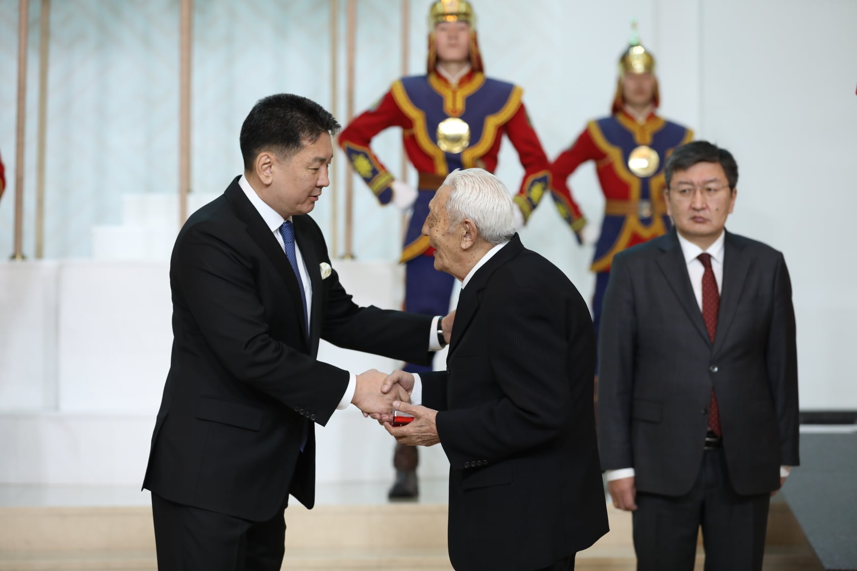 Наурызын баярыг тохиолдуулан Монгол Улсын Ерөнхийлөгч У.Хүрэлсүх төрийн дээд одон, медаль гардуулж байна.
