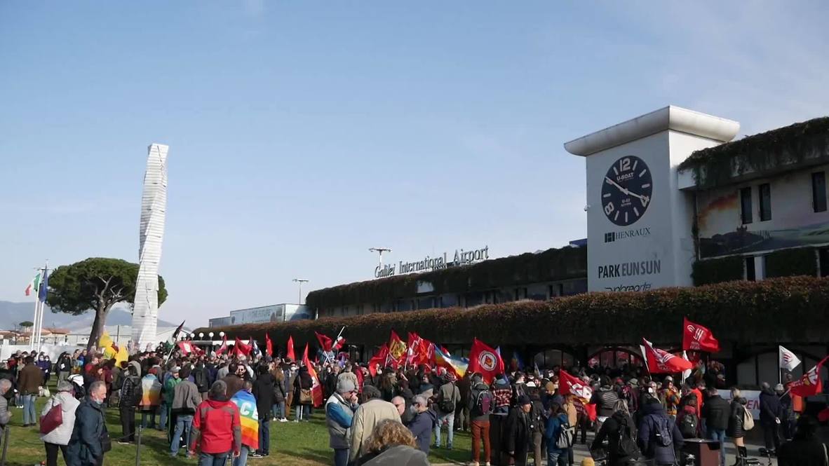 Пиза хотод болсон жагсаалд оролцогчид “Тусканиас дайны бус энх тайвны гүүр” гэсэн лозунг барин жагсжээ. Үйлдвэрчний эвлэлийн гишүүдээс гадна жагсаалд зүүнтний болон фашизмын эсрэг байгууллагууд нэгджээ. “Зэвсэглэлд зарцуулах мөнгийг ажилчдын цалин, хөлсийг нэмэгдүүлэхэд зориулах боломжтой” гэж жагсагчид онцолжээ.