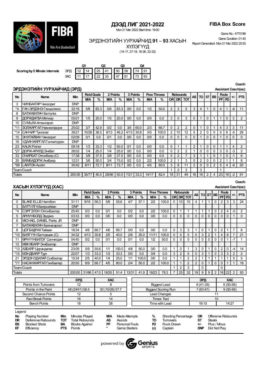 Уурхайчдын лидер Т.Санчир тун сайн тоглож, 29 оноо авсан ч ялж чадсангүй. Харин “Хасын Хүлэгүүд” баг хувилбар сайтай, тайван тогтвортой тоглосоор Лигийн долоо дахь түрүүгээ хүртлээ. Легионер Хэмилтон 24 оноогоор багтаа том тус хүргэлээ.