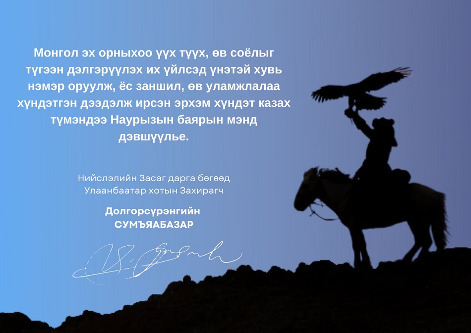 Хүн төрөлхтөн хийгээд Монгол эх орныхоо өв уламжлал, соёл дурсгалыг үеийн үед өвлүүлэн үлдээж, эрхэмлэн таниулахад үнэтэй хувь нэмэр оруулж буй эрхэм хүндэт казах түмэн Та бүхэндээ Наурызын баярын мэндийг дэвшүүлье.