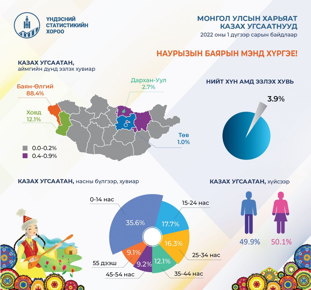 Мөн Монгол Улсад амьдарч буй Казах угсаатны 49.9 хувь нь эрэгтэй, 50.1 хувь нь эмэгтэй байна.