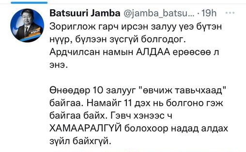Тэрбээр "Зориглож гарч ирсэн залуу үеэ бүтэн нүүр, бүлээн зүсгүй болгодог. АН-ын алдаа ерөөсөө л энэ. Өнөөдөр 10 залууг "өвчиж тавьчихаад" байгаа. Намайг 11 дэх нь болгоно гэж байгаа байх. Гэвч хэнээс ч хамааралгүй болохоор надад алдах зүйл байхгүй" хэмээн цахим хуудаснаа байр сууриа илэрхийлжээ.