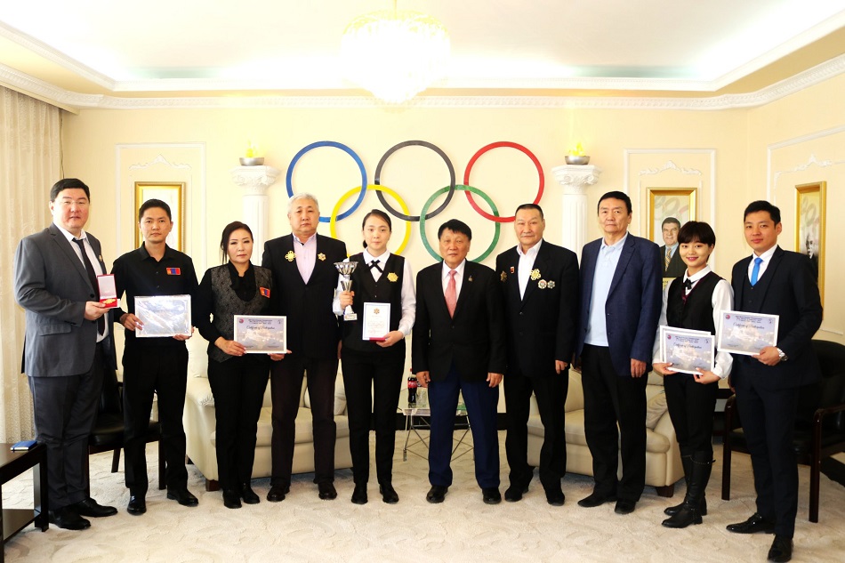Тухайлбал, Монголын бильярдын холбооны ерөнхийлөгч Б.Мандахбаяр, Монголын бильярдын холбоог үүсгэн байгуулагч, холбооны Удирдах зөвлөлийн гишүүн М.Мягмаржав, Д.Амаржаргал нарыг МҮОХ-ны “Алтан очир” одонгоор, тамирчин Б.Нарантуяаг “Олимпын алдар” одонгоор шагналаа.