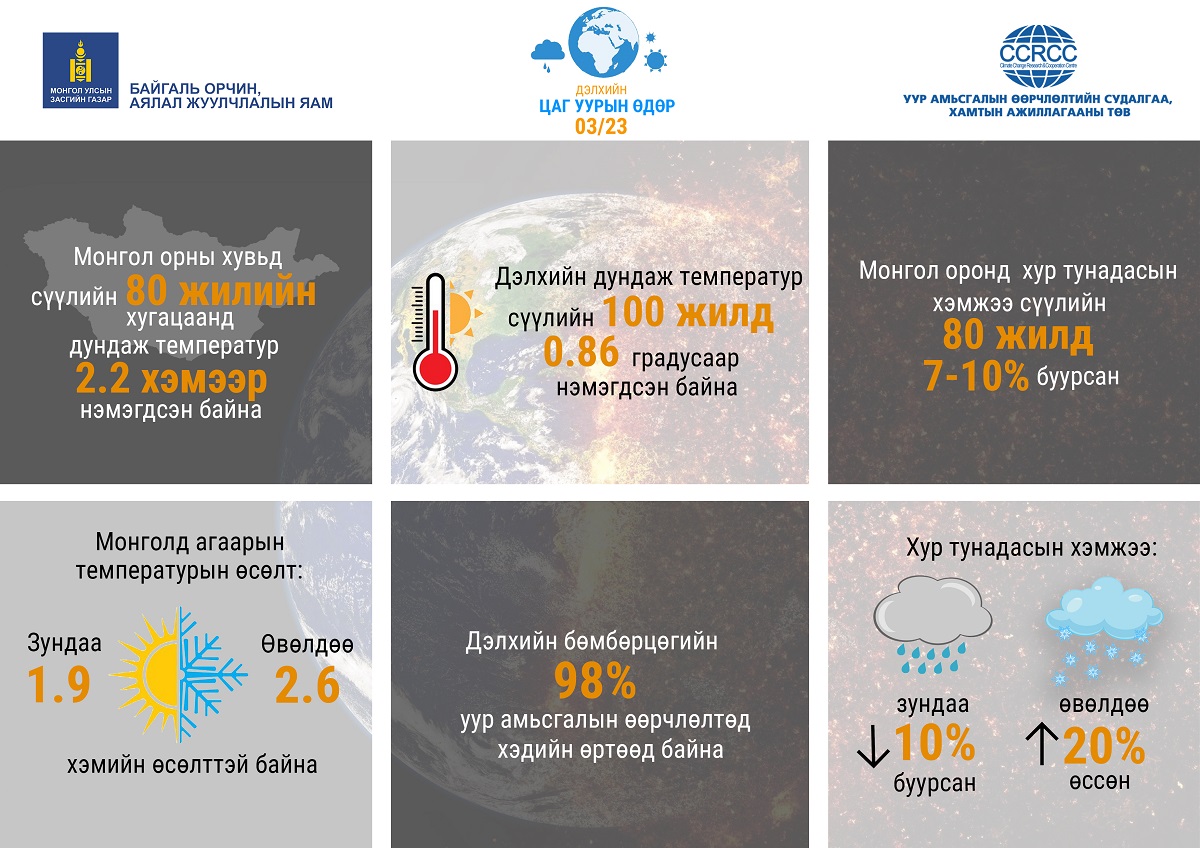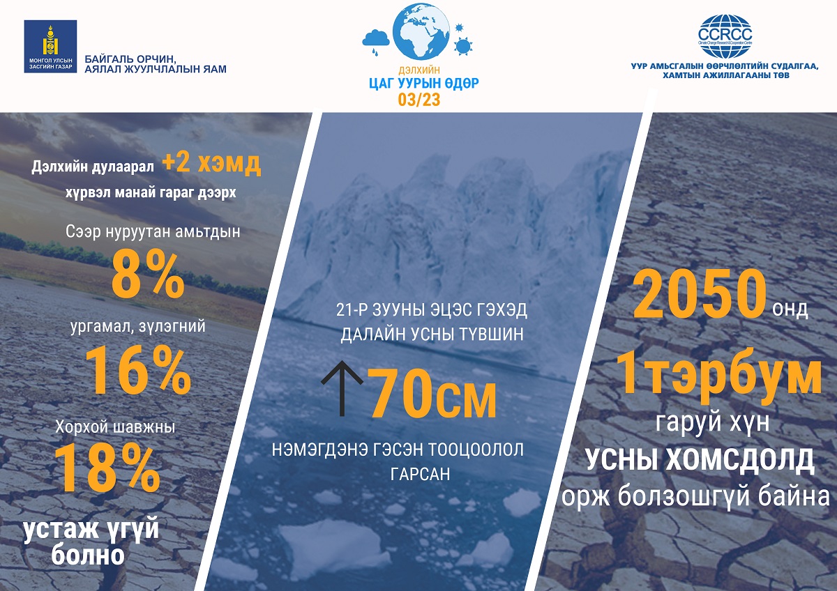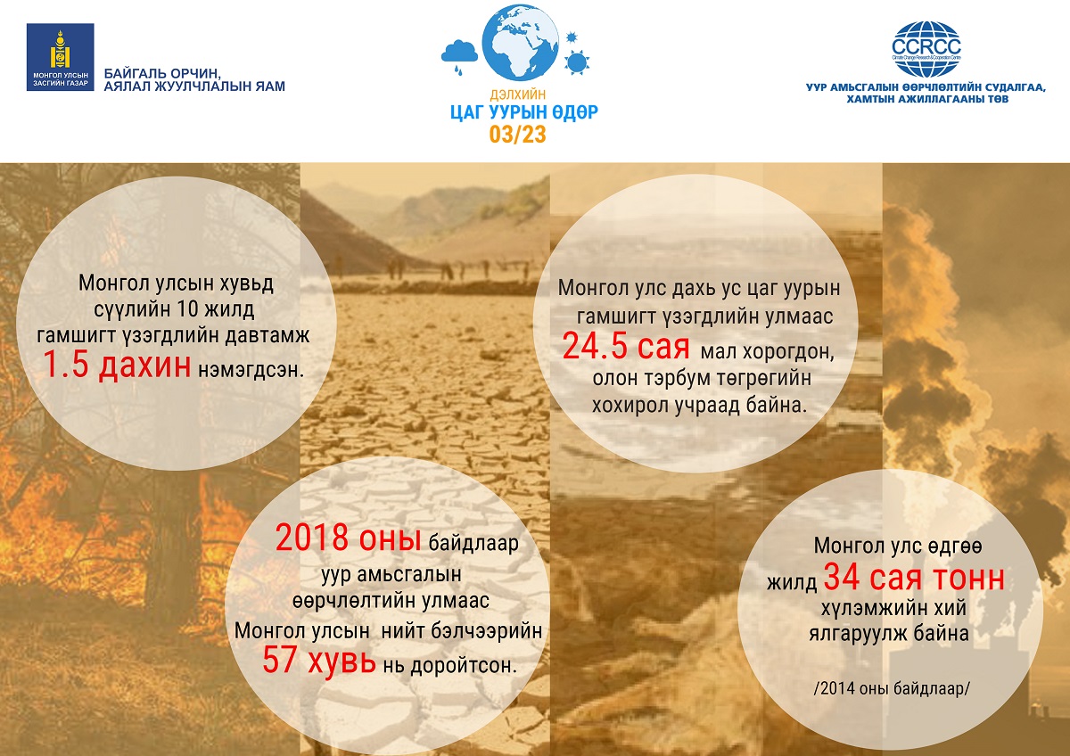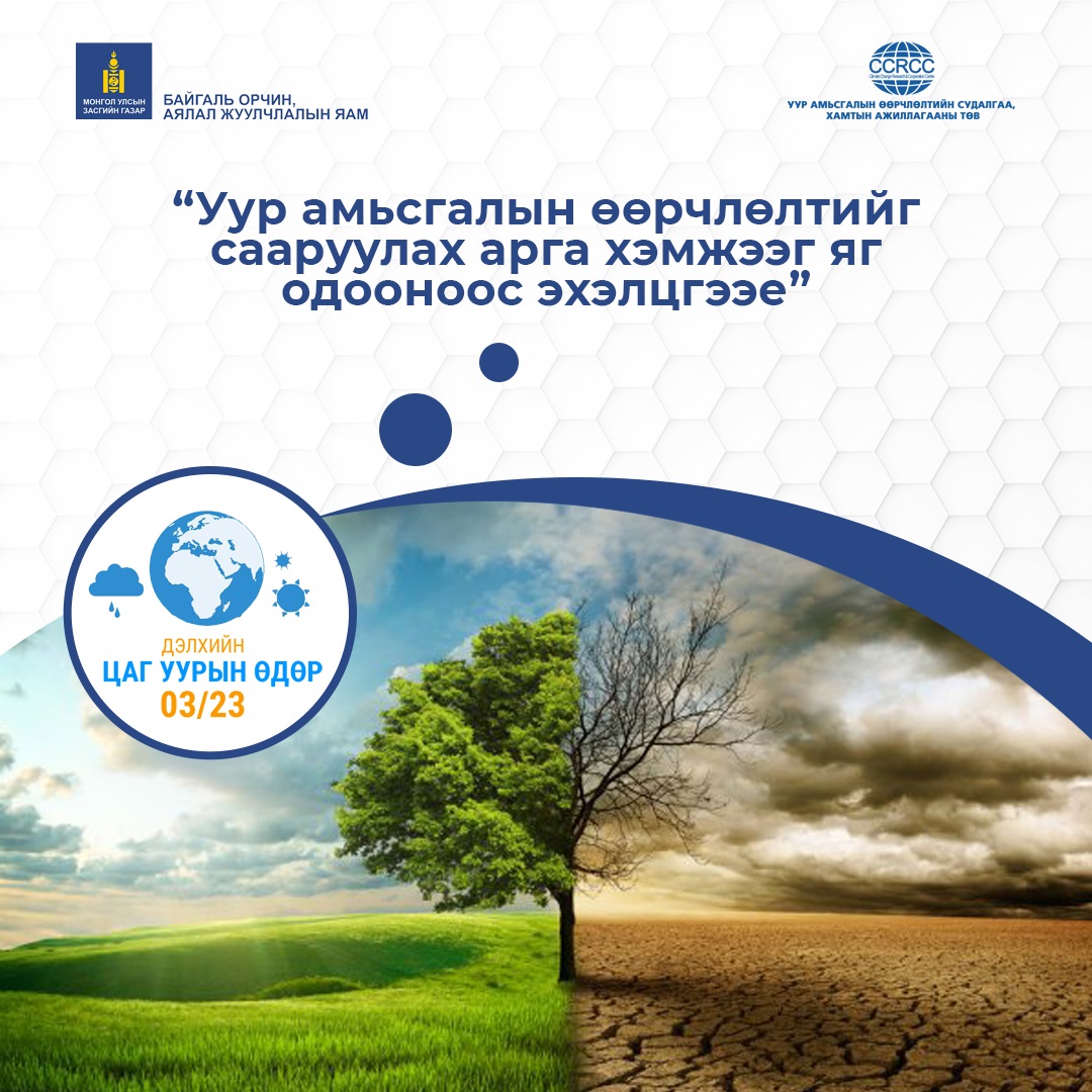 Өнөөдөр буюу 03 дугаар сарын 23-нд ДЭЛХИЙН ЦАГ УУРЫН ӨДӨР тохиож байна. Энэ жилийн дэлхийн цаг уурын өдрөөр “Уур амьсгалын өөрчлөлтийг сааруулах арга хэмжээг яг одооноос эхэлцгээе” буюу эрт анхаарал хандуулан арга хэмжээ авахыг уриалж байгаа юм. Уур амьсгалын өөрчлөлт нь  агаар мандал, байгалийн, хүний үйл ажиллагааны хүчин зүйлээс хамааралтай. Дэлхийн дундаж хэм 2 хэмээр нэмэгдвэл манай гараг дээрх хорхой шавжны 18%, ургамал, зүлэгний 16%, сээр нуруутан амьтдын найман хувь устаж үгүй болох эрсдэлтэй юм. Уур амьсгалын өөрчлөлтийг сааруулахын тулд дэлхийн дулаарлыг 1.5 цельсийн хэмд хязгаарлах ёстой бөгөөд сүүлийн 100 жилийн байдлаар 1.1 хэмээр дулаарсан байна.