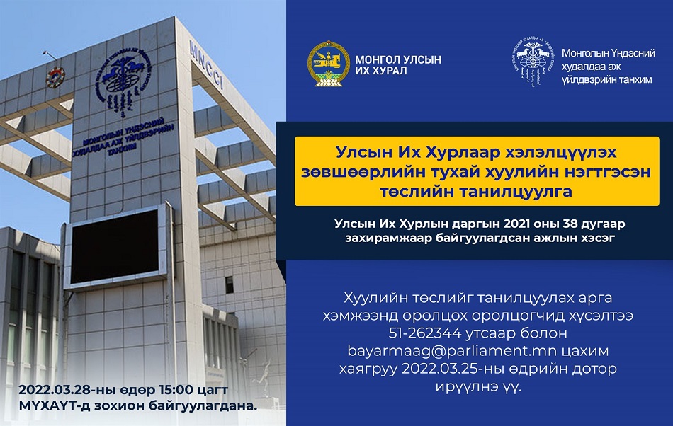 Иймд нэгтгэсэн төслийг танилцуулах арга хэмжээнд оролцохыг урьж байна. Оролцох албан тушаалтны овог, нэрийг 51-262344 утсаар болон bayarmaag@parliament.mn цахим хаягруу 2022 оны 3 дугаар сарын 25-ны өдрийн дотор ирүүлнэ үү.