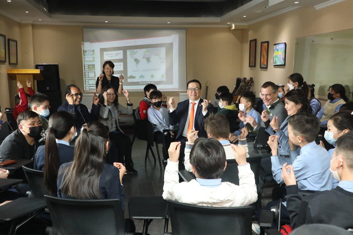Тэгвэл Байгаль орчин, аялал жуулчлалын сайд Б.Бат-Эрдэнэ, НҮБ-ын Хүнс, хөдөө аж ахуйн байгууллагын Монгол дахь Суурин төлөөлөгч Винод Ахужа, Германы олон улсын хамтын ажиллагааны нийгэмлэг (GIZ)-ийн хэрэгжүүлж буй Spaces/Stream төслийн удирдагч Михаэл Трокенбродт нар өнөөдөр (2022.03.24) “Ид шидийн орон” хүүхэд хамгааллын төвийн Улиастайн шинэ эцэст байрлах хоёрдугаар салбарт зочилж, багачууд хүүхдүүдтэй уулзсан юм.