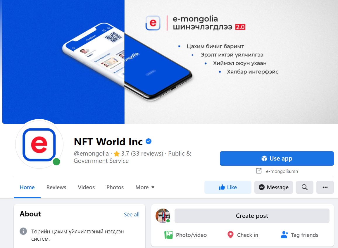 "E mongolia" төрийн цахим үйлчилгээний пэйж хуудсыг өнгөрсөн шөнө (2022.03.26) хакердаж, хулгайлсан байна. Хаягийн нэрийг "NFT World lnc" болгон өөрчилжээ.