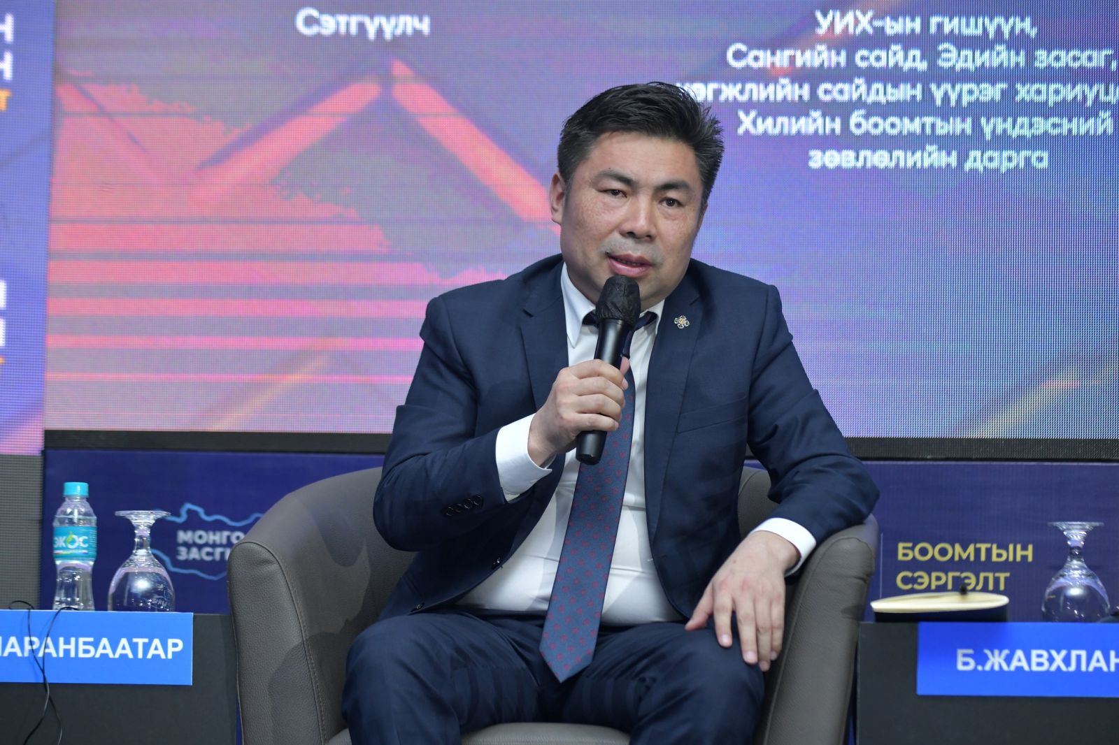 Сангийн сайд, Эдийн засаг хөгжлийн сайдын үүрэг хариуцагч, Хилийн боомтын үндэсний зөвлөлийн дарга Б.Жавхлан “Шинэ сэргэлтийн бодлого-Боомтын шинэчлэл” сэдвээр илтгэл танилцуулсан юм. Тэрбээр илтгэлдээ манай уул уурхайн түүхий эдийн үндсэн худалдан авагч БНХАУ-ын зах зээлийн цаашдын төлөв байдал, төмөр замын дэд бүтцийн тэлэлт болоод дотоодын нөхцөл байдал зэрэг мэдээллүүдийг өглөө.