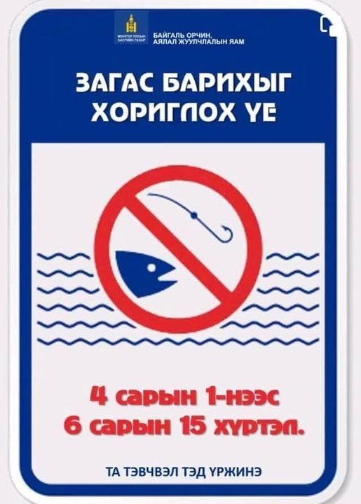 Амьтны тухай хуульд заасны дагуу жил бүрийн дөрөвдүгээр сарын 1-нээс зургадугаар сарын 15-ны өдрийг хүртэл загас агнах, барихыг хориглодог.  Учир нь энэ үеэр загасны үржлийн эд оргил үе байдаг.