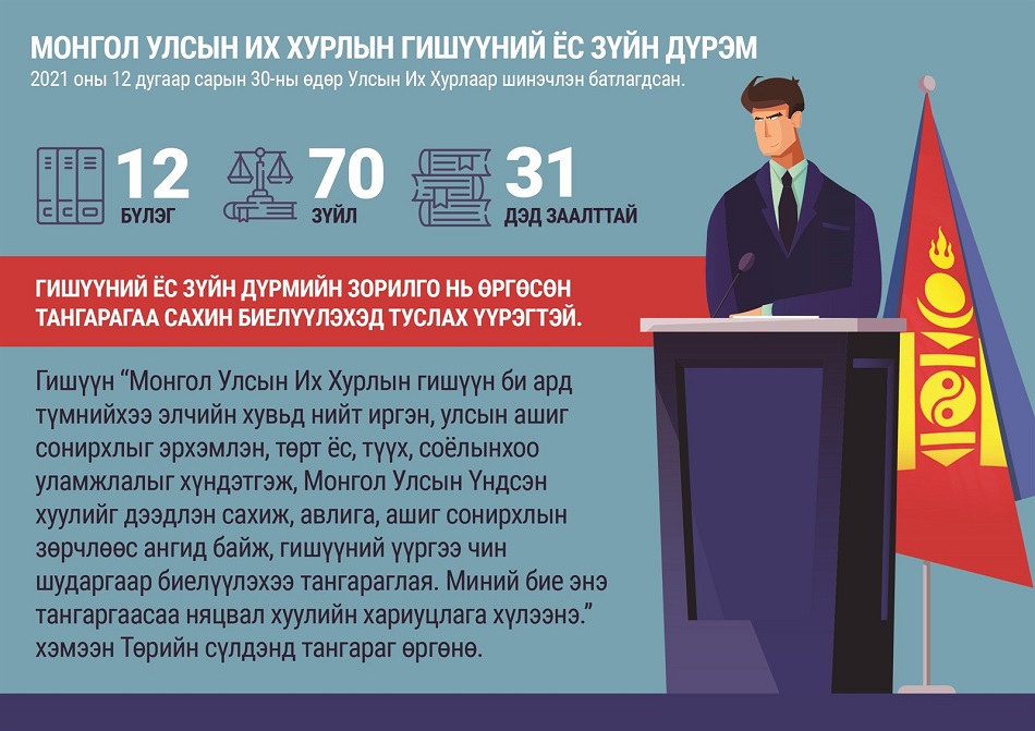 Улсын Их Хурлын 2021 оны намрын ээлжит болон 2022 оны ээлжит бус чуулганаар хэлэлцэж баталсан хууль тогтоомжийн талаарх танилцуулга, инфографикийг уншигч Та бүхэнд цувралаар хүргэж байна. Энэ удаа Монгол Улсын Их Хурлын гишүүний ёс зүйн дүрмийг шинэчлэн батлах тухай” Улсын Их Хурлын тогтоолын танилцуулга, инфографикийн хамт хүргэж байна.