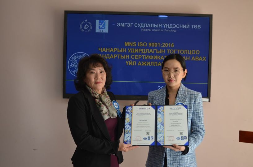 Эрүүл мэндийн яамны харьяа тусгай мэргэжлийн төв Эмгэг судлалын төв Чанарын менежментийн тогтолцоо ISO 9001:2015 олон улсын стандартыг үйл ажиллагаандаа нэвтрүүлж өнөөдөр хөндлөнгийн баталгаажуулалтын байгууллагаас сертификаа гардан авлаа.