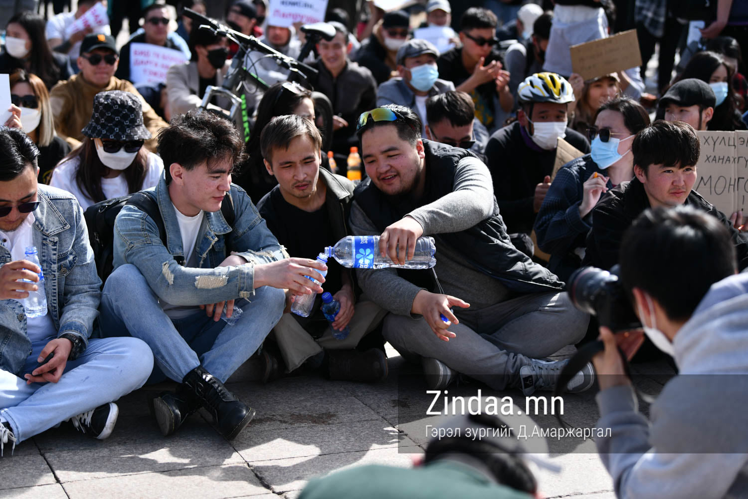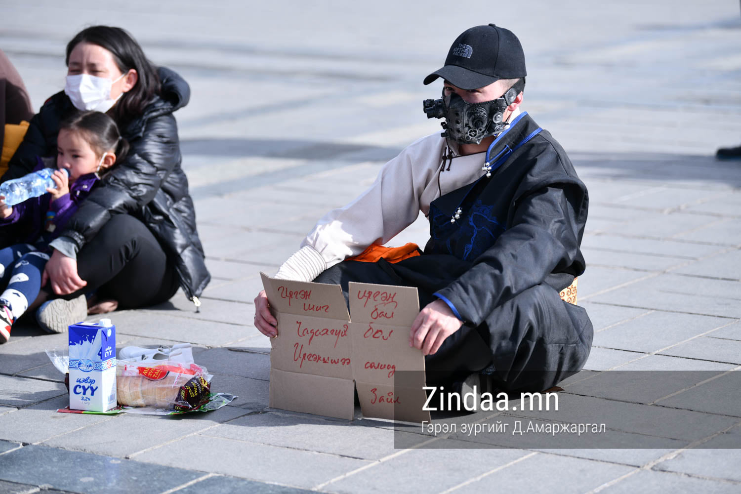 Эсэргүүцлээ илэрхийлж, төв талбайг тойрон гороолох залуусыг харахад цөхөрч, туйлдаа хүрсэн дүр зураг харагдана. "Гурав тойрчихлоо. Одоо жаахан амраад босъё" хэмээн ярилцаж, 2 литрийн савтай усыг жижиг сав руу юүлж, хувааж ууна. Учир нь тэд 500 граммтай усыг 2000 төгрөгөөр авч уухыг хүсэхгүй байна.