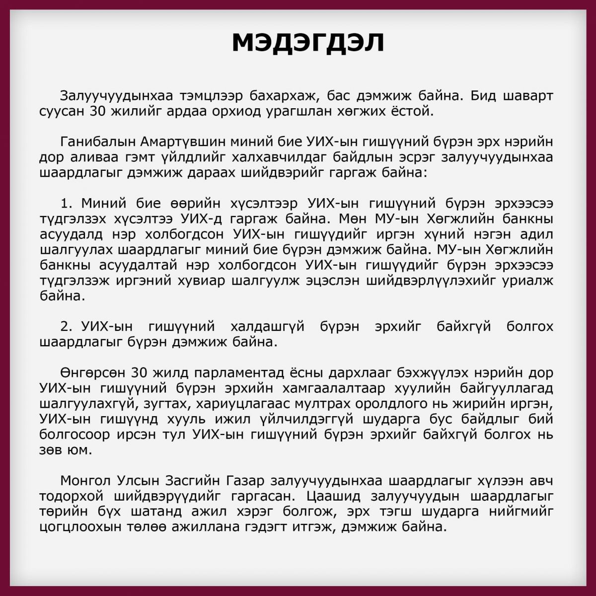 Тэрбээр "Ганибалын Амартүвшин миний бие УИХ-ын гишүүний бүрэн эрх нэрийн дор аливаа гэмт үйлдлийг халхавчилдаг байдлын эсрэг залуучуудынхаа шаардлагыг дэмжиж дараах шийдвэрийг гаргаж байна" гэжээ.