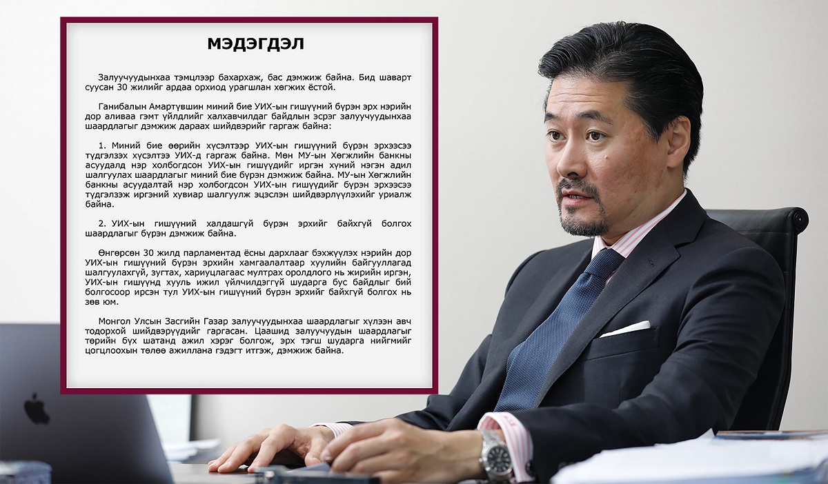 Тэгэхээр Г.Амартүвшин гишүүнийг хуулийн мэдлэггүйгээсээ болоод ийм үгийн алдаа гаргалаа гэж үзэх үү, хууран мэхлэх санаа анхнаасаа агуулж ийм мэдэгдэл гаргасан гэж бодох уу гэдэг нь өөрөө асуудал. Уг нь бол үнэхээр л шалгуулъя гэж бодож, нэр төрөө цэвэрлэж авъя гэж бодож байгаа бол гишүүний бүрэн эрхээсээ чөлөөлөгдөх хүсэлтээ өгөх байв. Хэрэв тэгж чадвал жинхэнэ улстөрчийн ёс зүйн хувьд сайн жишиг болох байлаа.