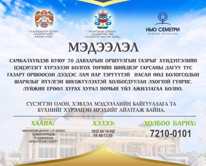 Монголын Бурхан шашинтны төв Гандантэгчэнлин хийдээс Самбалхүндэв буюу 70 давхарын оршуулгын газрыг хүндэтгэлийн цэцэрлэгт хүрээлэн болгох төрийн шийдвэр гарсны дагуу тус газарт оршоосон дээдэс лам нар тэргүүтэй насан өөд бологсдын шарилыг нүүлгэн шилжүүлэхтэй холбогдуулан хурал номын үйл ажиллагаа зохион байгуулна.