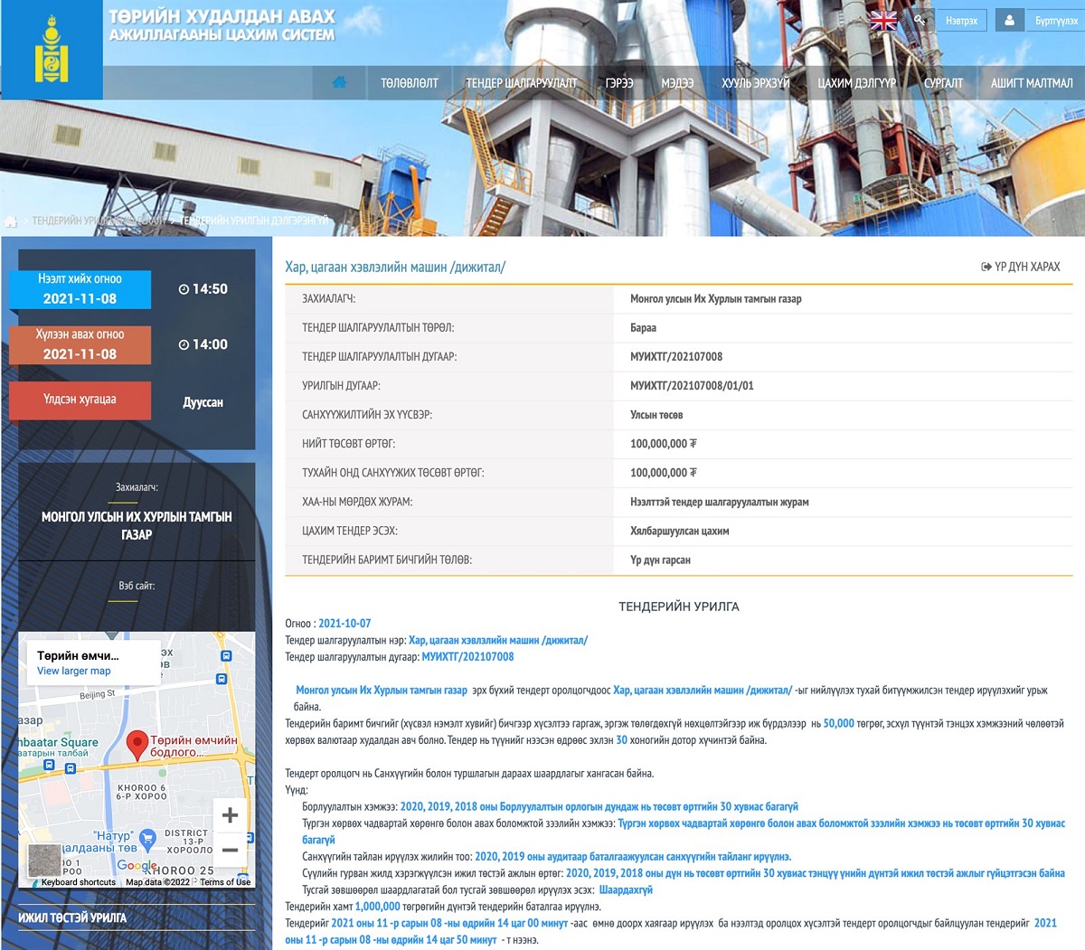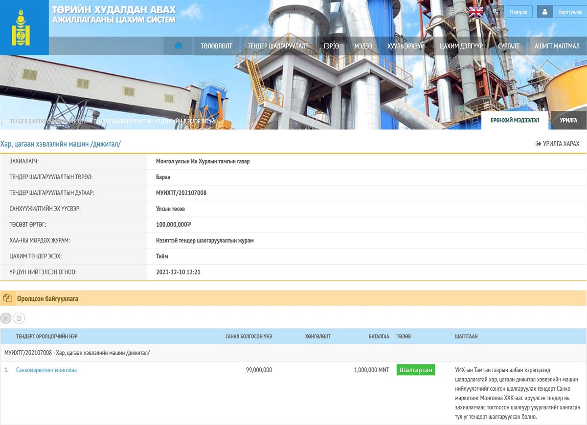 Тамгын газраас “Төрийн болон орон нутгийн өмчийн хөрөнгөөр бараа, ажил, үйлчилгээ худалдан авах тухай” хуулийн дагуу уг хэвлэлийн машиныг нийлүүлэгчийг нээлттэй сонгон шалгаруулах зарыг Төрийн худалдан авах ажиллагааны цахим систем tender.gov.mn сайтад 2021 оны 10-р сард албан ёсоор байршуулж, нийлүүлэгчийг шалгаруулан, 2021 оны 12-р сард гэрээ байгуулсан. Тендерт шалгарсан “Санко маркетинг Монголиа” ХХК нь гэрээний дагуу “Konica minolta” хэвлэлийн машиныг 2022 оны 1-р сард нийлүүлж, төлбөрийг 2022 оны 3-р сард шилжүүлсэн болно.