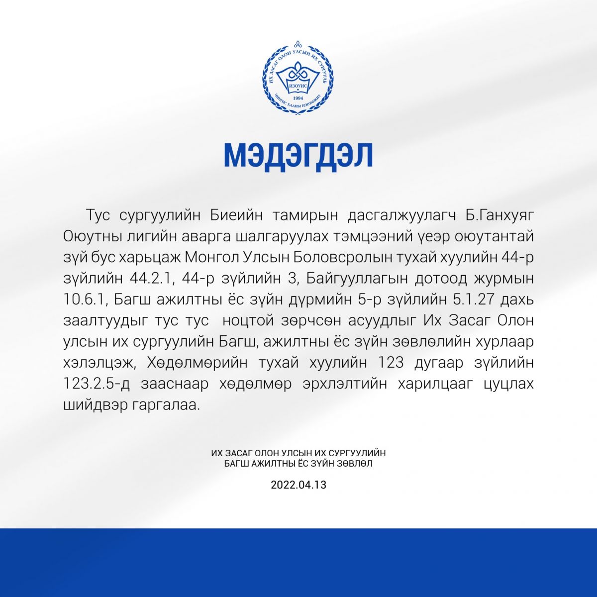 Тодруулбал, Монгол Улсын боловсролын тухай хуулийн 44-р зүйлийн 44.2.1, 44-р зүйлийн 3, Байгууллагын дотоод журмын 10.6.1, Багш ажилтны ёс зүйн дүрмийн 5-р зүйлийн 5.1.27 дахь заалтуудыг тус тус ноцтой зөрчсөн гэж үзлээ. Улмаар багш ажилтны ёс зүйн зөвлөлөөр хэлэлцэж, Хөдөлмөрийн тухай хуулийн 123 дугаар зүйлийн 123.2.5-д зааснаар хөдөлмөр эрхлэлтийн харилцааг цуцлах шийдвэр гаргасан байна.