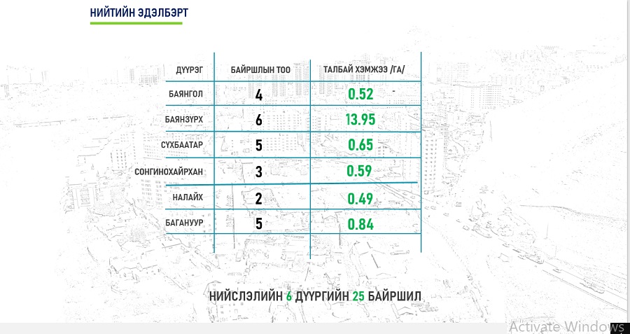 Нийтийн эдэлбэрийн газарт хамааруулж болохуйц байршил, бусдын эзэмшил, ашиглалтад олгогдоогүй цэцэрлэгт хүрээлэн, ногоон байгууламж бүхий байршлуудын газар ашиглалтын байдалд судалгаа хийжээ. Улмаар 25 байршлыг тодорхойлон, нийслэлийн 2022 оны газар зохион байгуулалтын төлөвлөгөөнд тусгагдсан нийт 17 га газрыг нийтийн эдэлбэрт бүртгэх асуудлыг зөвлөлийн хуралд танилцууллаа.