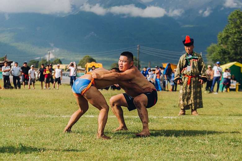 Буриад үндэсний бөхөөр бөхчүүд улаан, цэнхэр бүстэй, шуудаг эсвэл шорттой барилддаг.