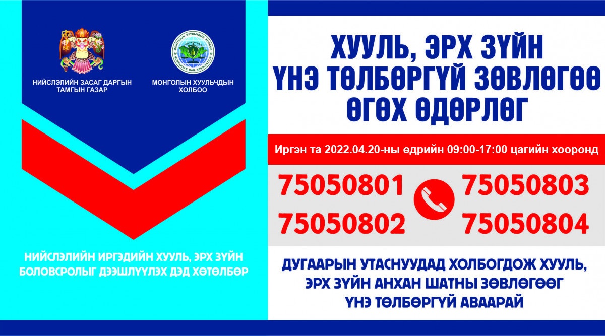 Энэ сарын өдөрлөгийг маргааш буюу дөрөвдүгээр сарын 20-нд 09:00-17:00 цагийн хооронд зохион байгуулах юм. Иймд  иргэн та 75050801, 75050802, 75050803, 75050804 дугаарын утсаар холбогдож өөрт хэрэгтэй хууль, эрх зүйн зөвлөгөө, мэдээллийг авах боломжтой.