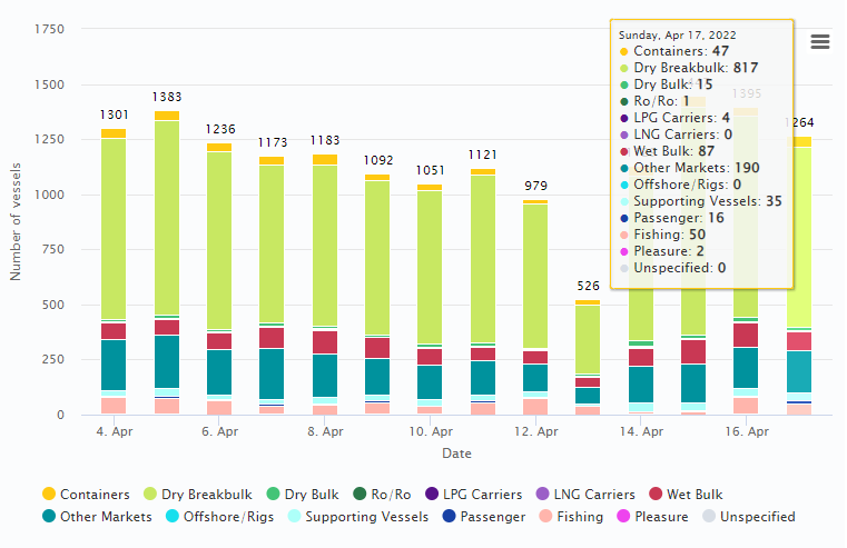 2022 оны дөрөвдүгээр сарын 17-ны өдрийн хөлөг онгоцны төрлүүдийг харвал задгай ачааны хөлөг онгоц 817, чингэлэг тээврийн хөлөг онгоц-15, Ro/Ro-1, шингэн задгай ачааны хөлөг онгоц 87, загас агнуур 50, LPG танкер хөлөг онгоц 4, туслах хөлөг онгоц 35, зорчигч 16  бусад 190  төрлийн хөлөг онгоцнууд зогссон байна.