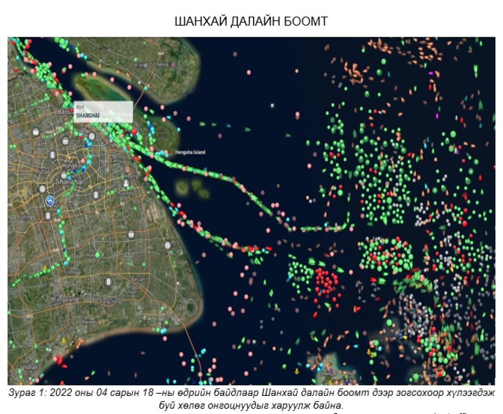 Тодруулбал,  БНХАУ-ын Шанхай хотод ковидын халдварын тохиолдол ихэсч, хөл хорио тогтоосонтой холбоотойгоор 2022 оны дөрөвдүгээр сарын 18-ны байдлаар далайн боомт дээр  809 хөлөг онгоц зогсож байна.