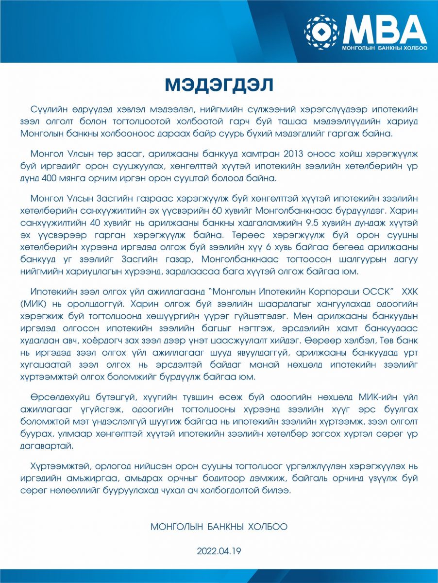 Сүүлийн өдрүүдэд хэвлэл мэдээлэл, нийгмийн сүлжээний хэрэгслүүдээр Ипотекийн зээл олголт болон тогтолцоотой холбоотой гарч буй ташаа мэдээллийн хариуд Монголын банкны холбооноос дараах байр суурь бүхий мэдэгдлийг гаргав.