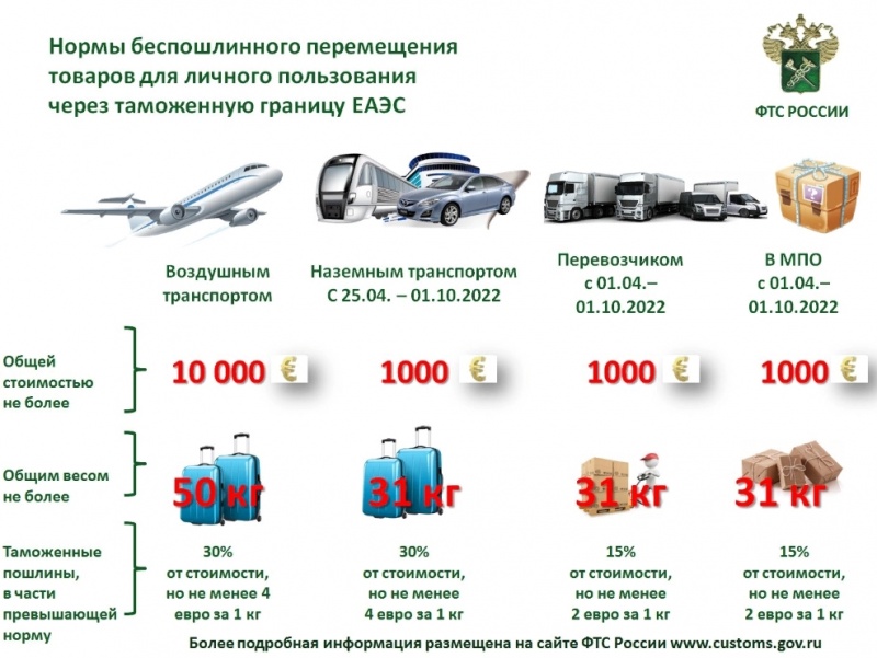 ОХУ-ын Гаалийн газраас хилээр татваргүй нэвтрүүлэх барааныхаа хэмжээг нэмлээ. 2022 оны аравдугаар сарын 1 хүртэл хилээр 1000 евро хүртэлх үнэтэй болон 31 кг барааг татваргүй нэвтрүүлнэ. Хэрэв дээрх хэмжээнээс илүү гарвал 1 кг-д 4 еврогийн татвар төлнө.
