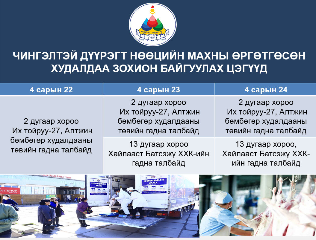 Нийслэлийн Засаг даргын 2019 оны А/889 дүгээр захирамж, Улаанбаатар хотын Ерөнхий менежерийн 2022 оны “Нийслэлийн хүн амын махны хангамж, хүртээмжийг тогтвортой байлгах талаар авах зарим арга хэмжээний тухай” А/18 дугаар тушаалын дагуу нөөцийн махны өргөтгөсөн худалдааг 2022 оны 04 дүгээр сарын 22, 23, 24-ний өдрүүдэд зохион байгуулна.