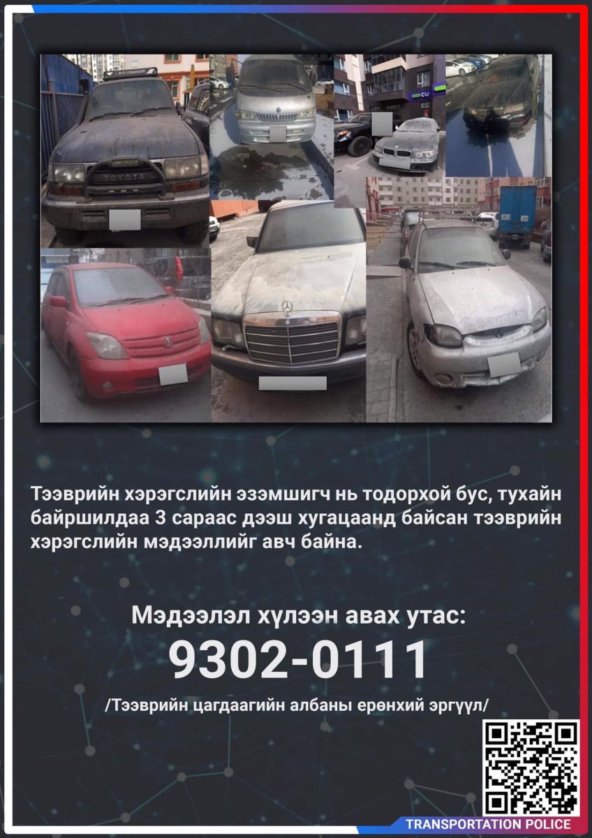 Тиймээс тээврийн хэрэгслийн эзэмшигч нь тодорхой бус, тухайн байршилдаа удаан хугацаагаар орхигдсон автомашины мэдээллийг Тээврийн цагдаагийн албаны ерөнхий эргүүлийн 93020111 утсанд холбогдон өгнө үү.