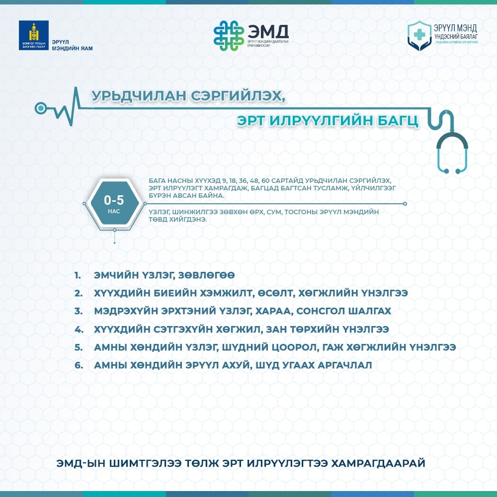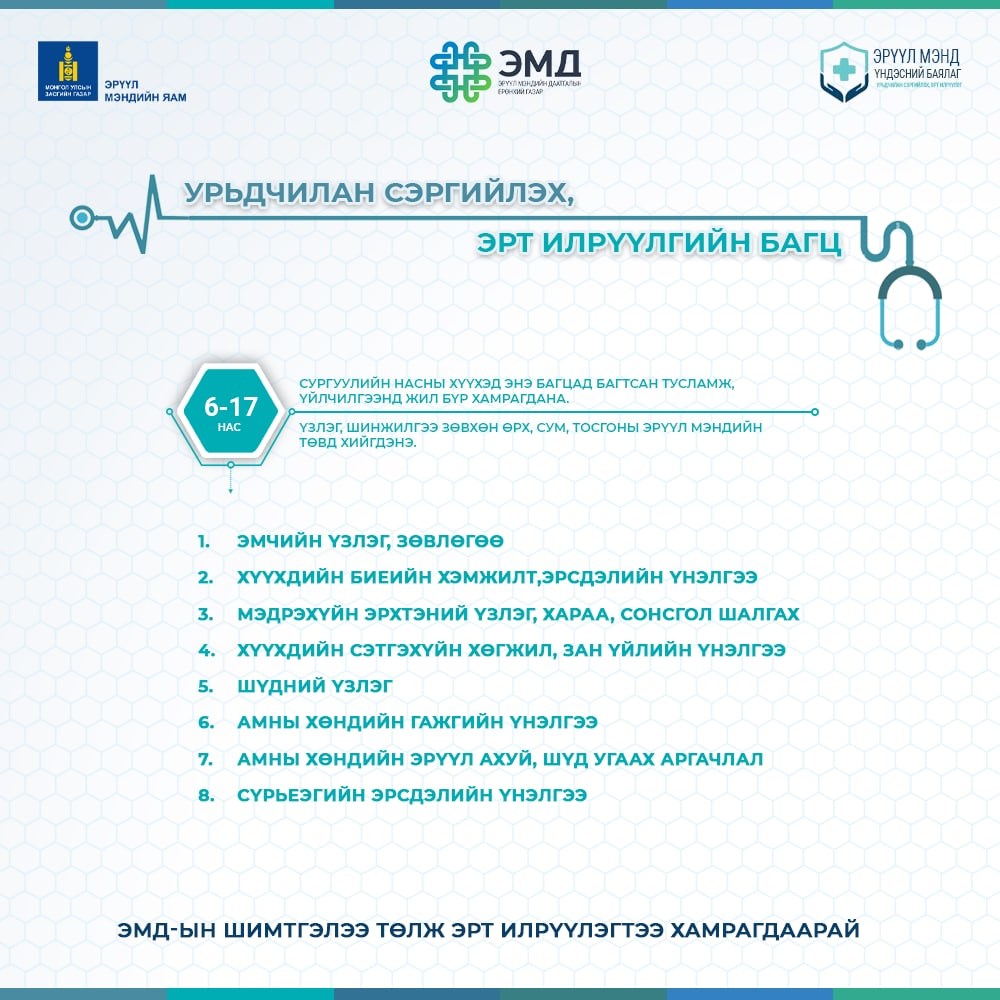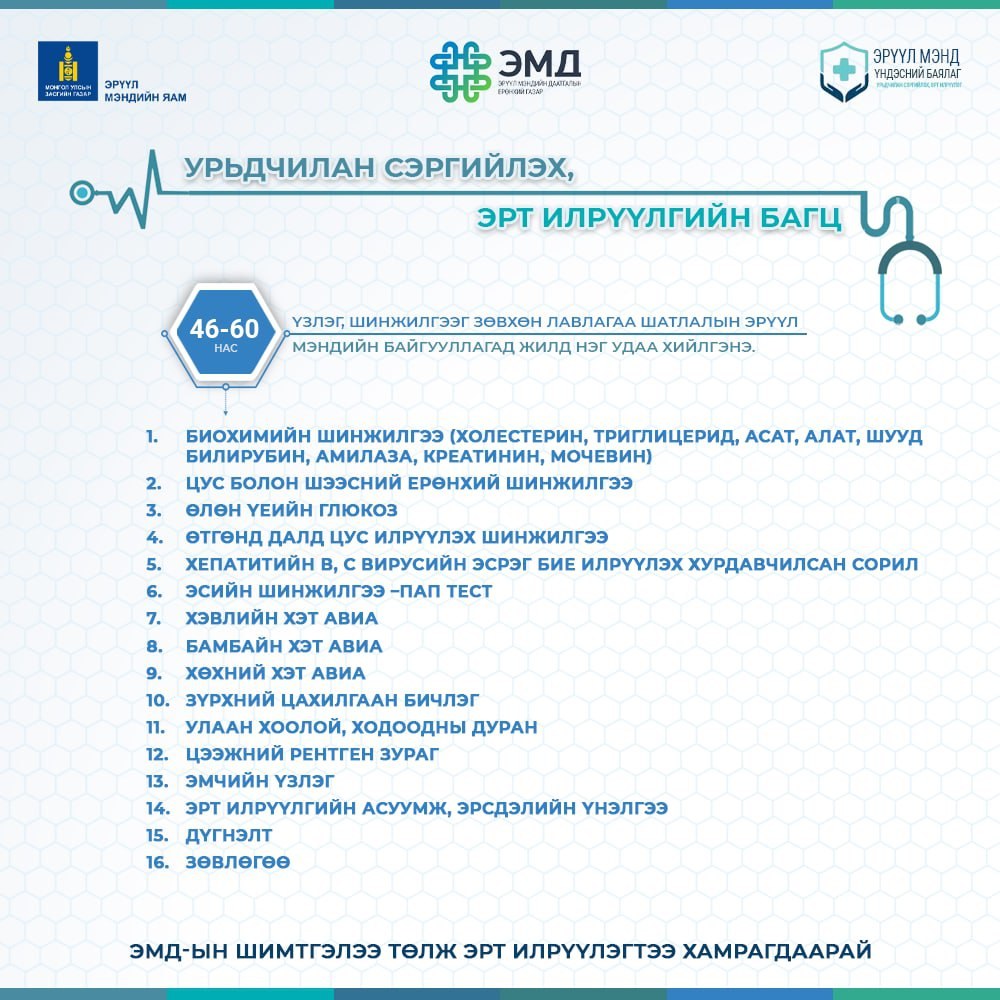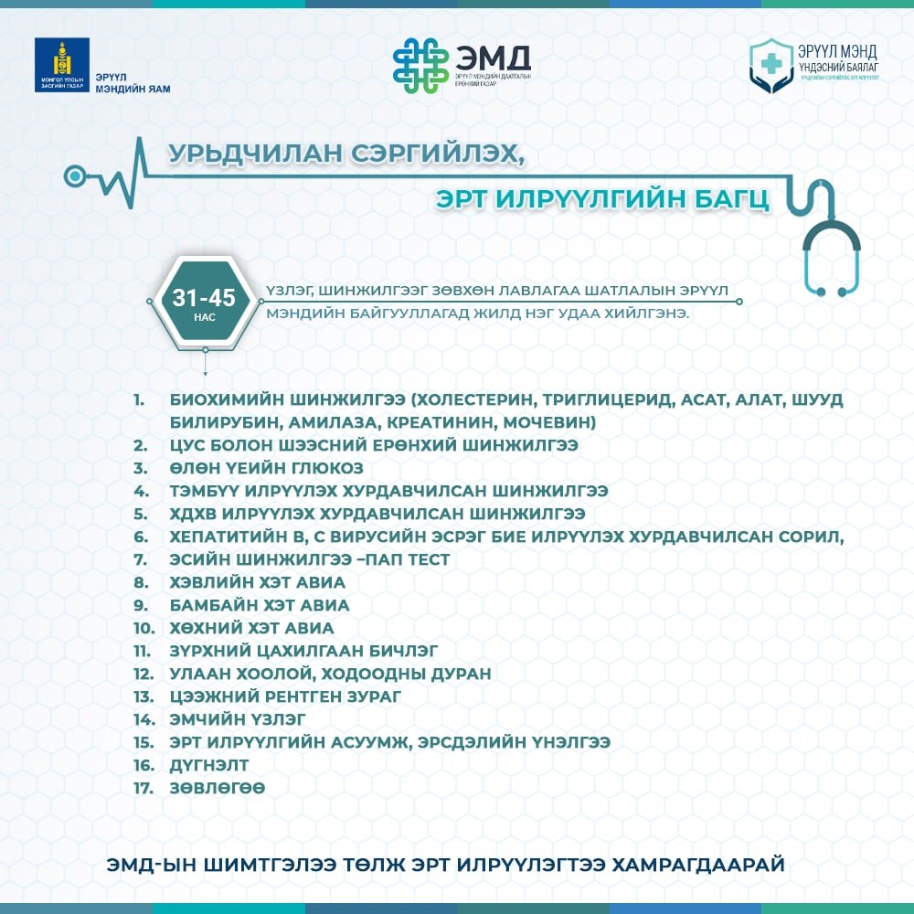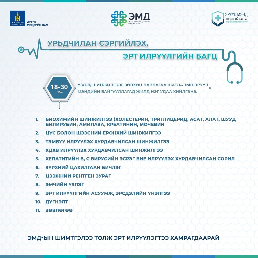 Үзлэг, шинжилгээ зөвхөн өрх, сум, тосгоны эрүүл мэндийн төвд хийгдэнэ. Тус үзлэгийн насны багцуудад багтсан үзлэг, оношилгоо, шинжилгээ болон товлолт хугацааны талаарх дэлгэрэнгүй мэдээллийг танилцуулж байна.
