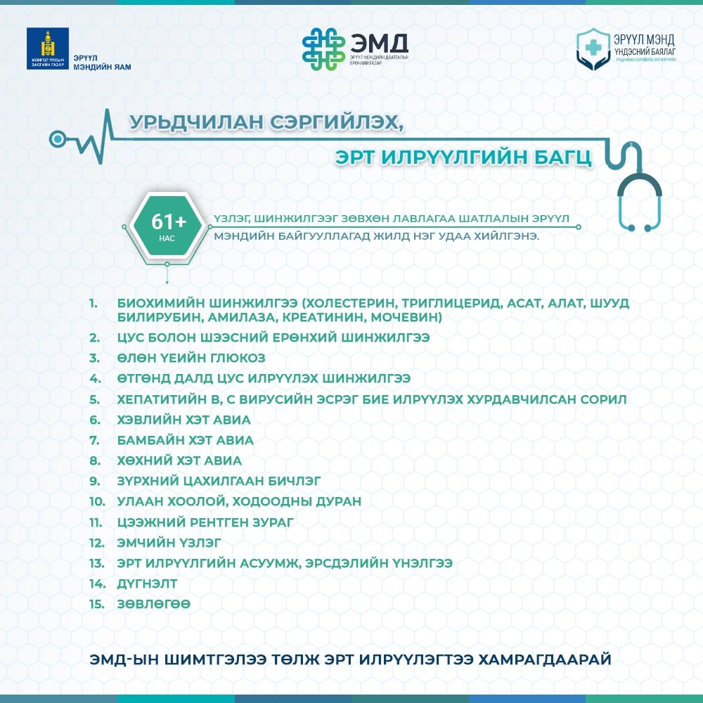 Монгол Улсын Засгийн газрын санаачилгаар эрүүл мэндийн даатгалаар хийгдэх Урьдчилан сэргийлэх, эрт илрүүлэх үзлэгийг 2022 оны тавдугаар сарын нэгнээс эхлэн орон даяар зохион байгуулна.
