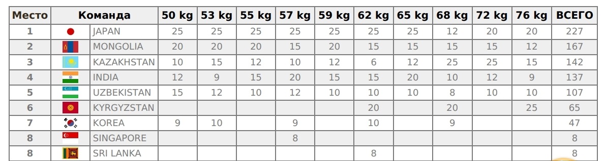 Нийт найман орны 60 тамирчин хүч сорьж, ихэнх жинд тойргийн сисемээр аваргыг тодруулсан. Японы баг 7 алт, 2 мөнгөн медаль хүртэж, 227 оноогоор тэргүүлсэн. Монголын баг алтан медаль авч чадаагүй ч 4 мөнгө, 5 хүрэл буюу 76 кг-аас бусад жинд медаль авч, 167 оноотой удааллаа. Тэдний араас 2 алт, 2 мөнгөтэй Казахстаны шигшээ оржээ.