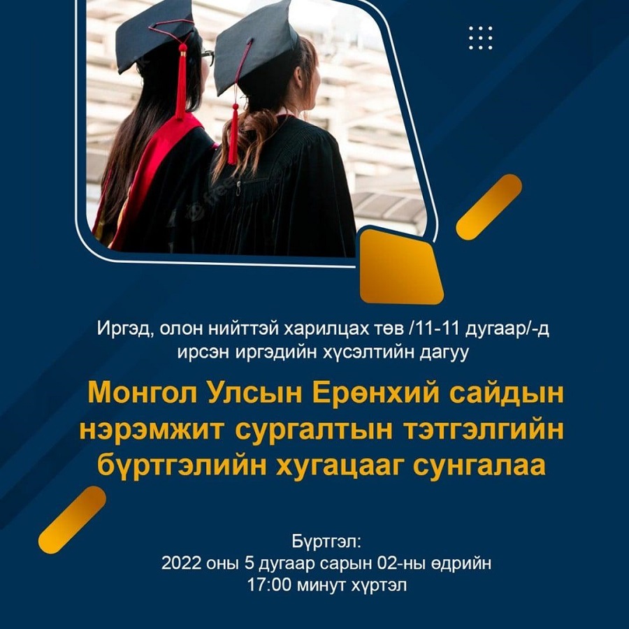 Засгийн газрын Иргэд, олон нийттэй харилцах 11-11 төвд ирсэн иргэдийн хүсэлтийн дагуу Монгол Улсын Ерөнхий сайдын нэрэмжит сургалтын тэтгэлгийн бүртгэлийн хугацааг 2022 оны тавдугаар сарын хоёрны 17:00 цаг хүртэл сунгалаа.