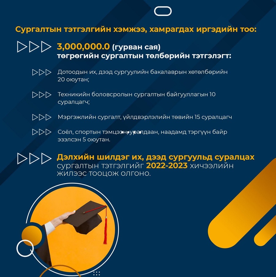 Мэдлэг боловсрол, бүтээлч чанар, шинэ санаа, сайн үйлс, авьяас, ур чадвараараа онцгой амжилт гаргасан их, дээд сургуулийн бакалаврын хөтөлбөр, коллеж, мэргэжлийн сургалт, үйлдвэрлэлийн төвийн оюутан, суралцагч болон дэлхийн шилдэг 100 их, дээд сургуулийн магистр, докторын үндсэн хөтөлбөрт суралцах эрх авсан иргэдийг Монгол Улсын Ерөнхий сайдын нэрэмжит сургалтын тэтгэлгийн сонгон шалгаруулалтад оролцохыг урьж байна.
