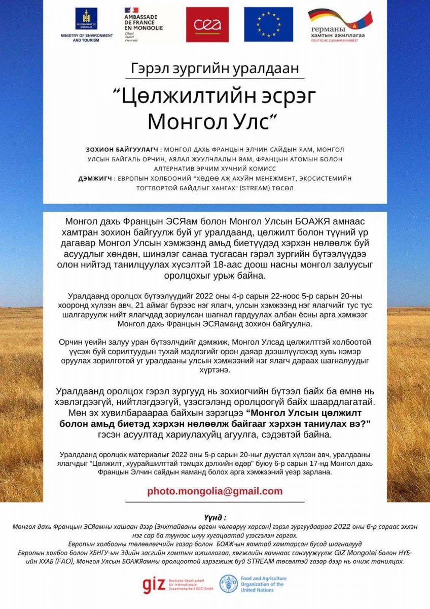 Ургамлын тоо цөөрч, элсэрхэг газар улам тэлэн гол цөөрөм ширгэж байгаа энэ үед цөлжилт нь Монголд санаа зовоосон асуудал хэвээр байна.Тиймээс цөлжилтийн нөхцөл байдлыг олон нийтэд таниулах, хор уршгийн бодит нөхцөл байдлыг иргэдэд таниулах, хүүхдийн нүдээр байгаль дэлхийг тольдох, тэдний дуу хоолойг томчуудад хүргэх зорилгоор Европын холбоо, БОАЖЯ болон Монгол дахь Францын элчин сайдын яам хамтран Монгол орны дөрвөн зүг найман зовхист аж төрж, суралцаж буй Ерөнхий боловсролын сургуулийн сурагчдын дунд “Цөлжилтийн эсрэг Монгол Улс” сэдэвт фото гэрэл зургийн уралдааныг зарлаж байна.