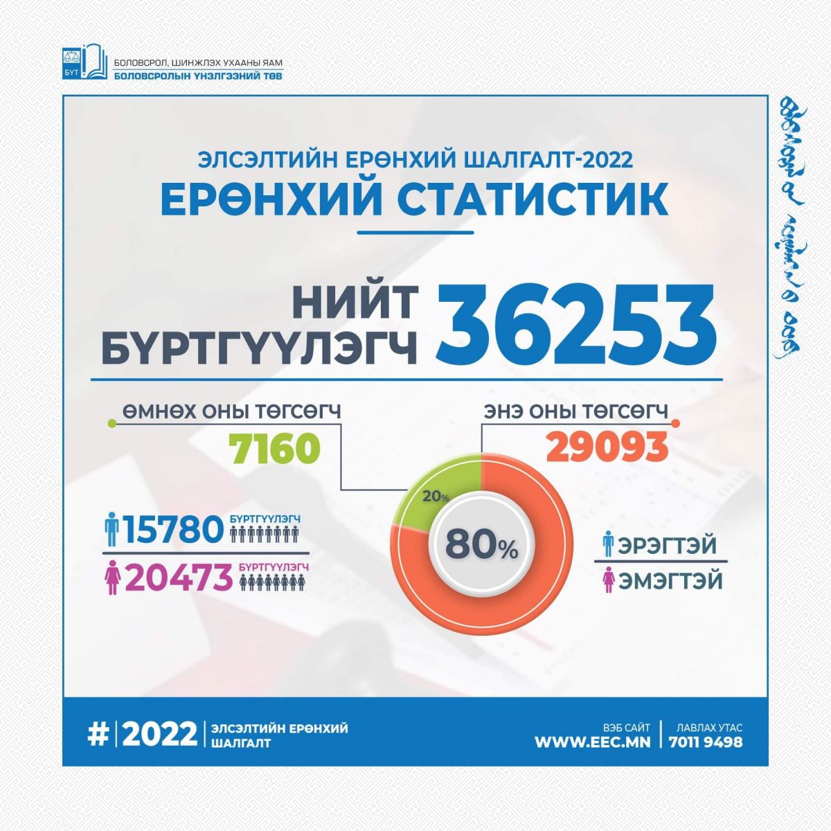 2022 оны элсэлтийн ерөнхий шалгалтад 36253 шалгуулагч бүртгүүлсэн байна