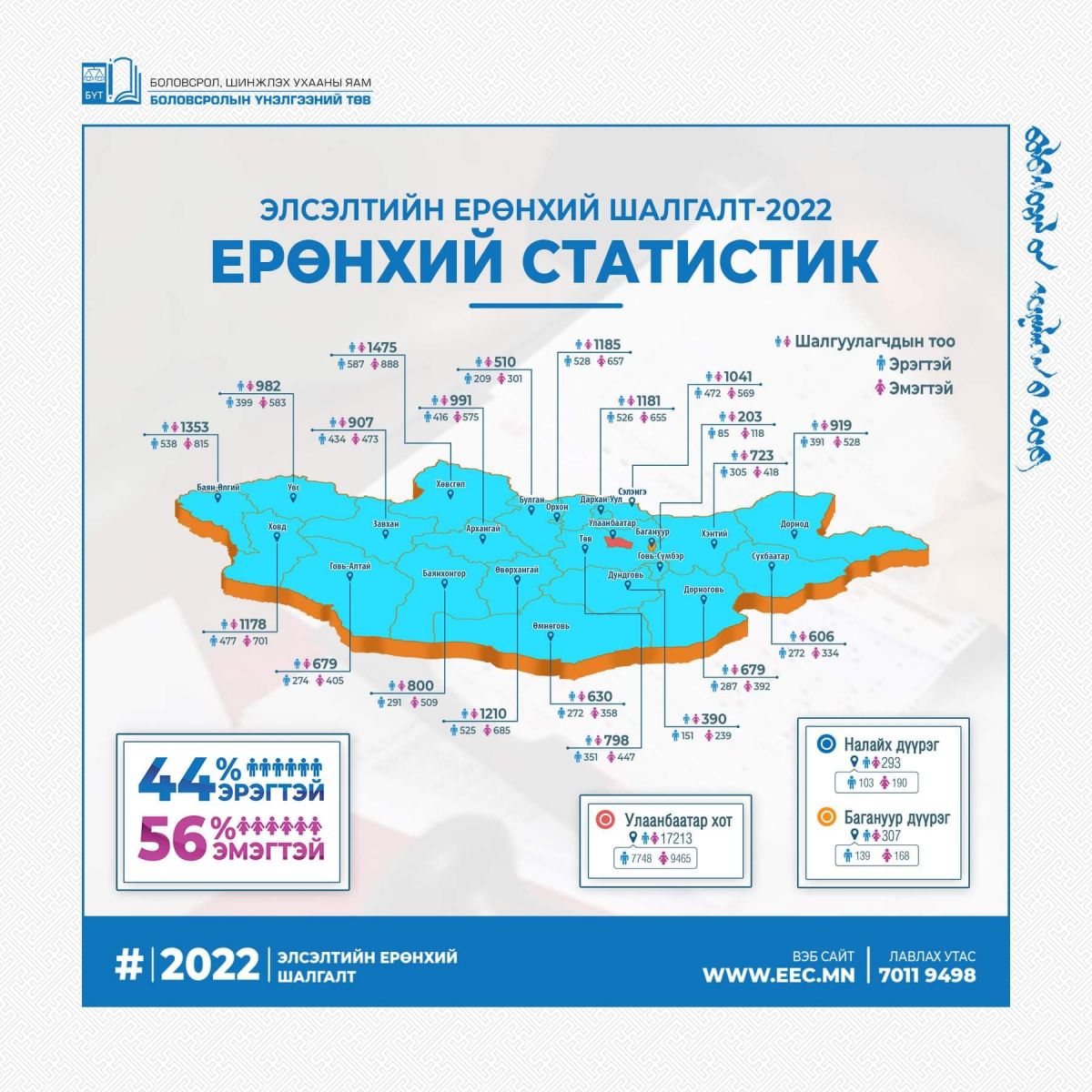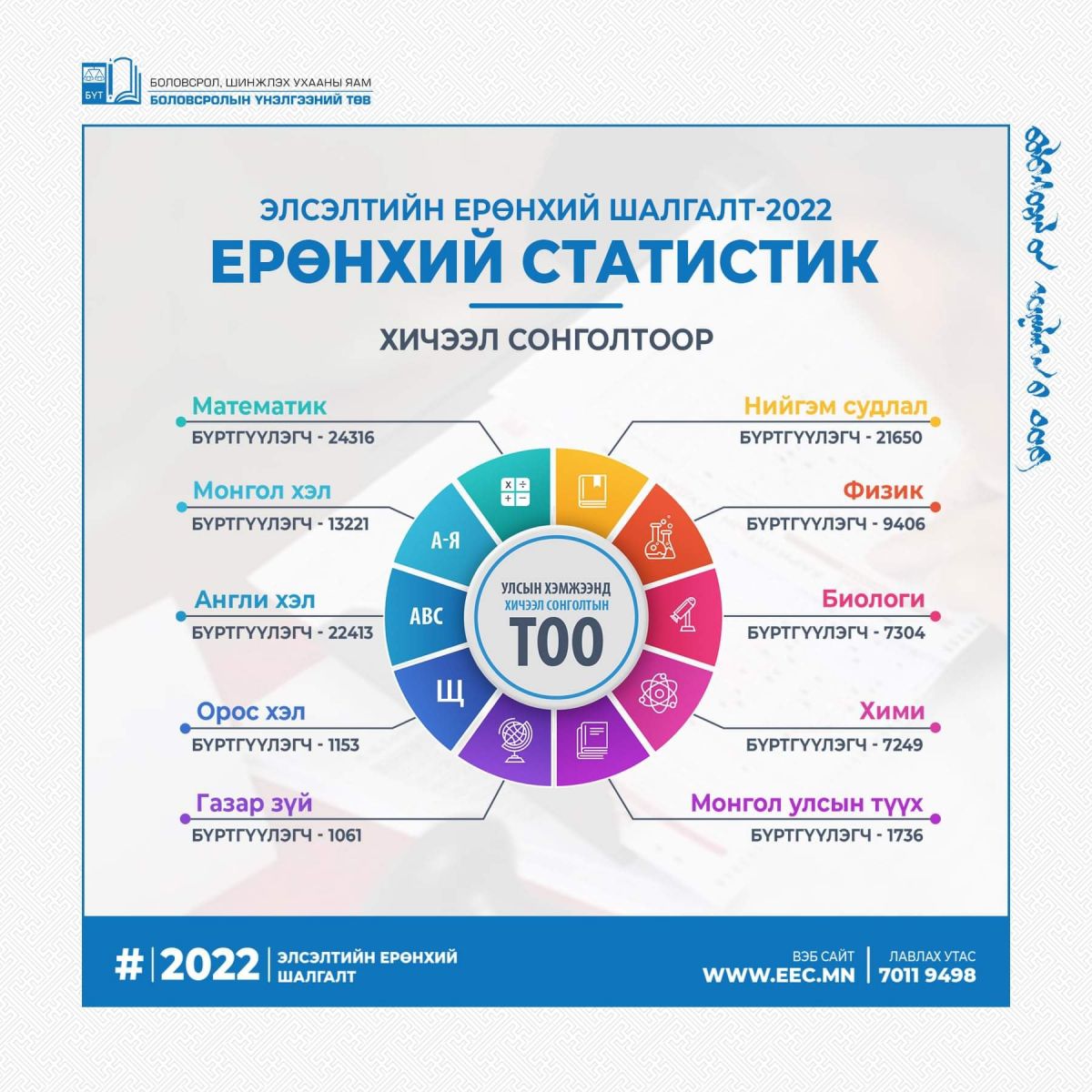 Монгол улсын хэмжээнд их, дээд сургуульд элсэгчдийн сурах ерөнхий чадвар, мэдлэгийн түвшинг тогтоох зорилготой “Элсэлтийн ерөнхий шалгалт” –ын 2022 оны онлайн бүртгэл Улаанбаатар хотын цагаар 02-р сарын 14-ний 09:00 цагаас 04-р сарын 25-ны 18:00 цаг хүртэл eyesh.eec.mn цахим хуудсаар явагдлаа. Улсын хэмжээнд нийт 36253 шалгуулагч бүртгүүлсэн байна.