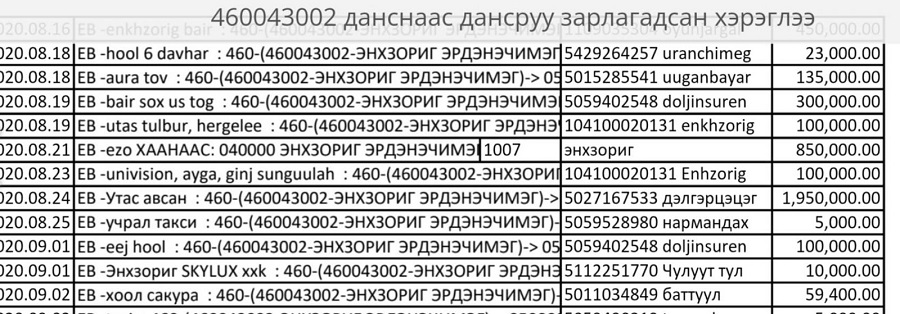 Эхэн үедээ Э.Энхзориг ойр зуурын хэрэглээний мөнгө төгрөгийг надад хэлж шилжүүлэн авах, эсвэл найз нөхдийнхөө тооцоог өөрийн данс руу шилжүүлэн аваад өөрөө хэрэглэдэг байсан.