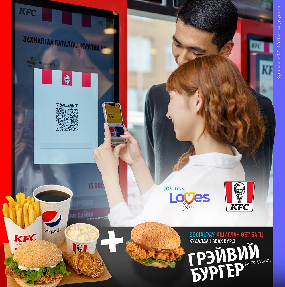Монголын анхны дижитал хэтэвч SocialPay аппликэйшн үнэнч хэрэглэгчдэдээ зориулсан “SocialPay Loves You” аяны хүрээнд энэ оны хамгийн эхний бэлгээ задалж байна. Энэ бол KFC Mongolia-тай хамтарсан “SocialPay Loves KFC” урамшуулалт хөтөлбөр юм. Эрхэм SocialPay-ийн хэрэглэгч та энэхүү хөтөлбөрийн хүрээнд KFC Mongolia-ийн бүх салбаруудаар “Өег” багц худалдан аваад урамшуулалд “Грэйвий” бургер үнэгүй авах боломжтой.