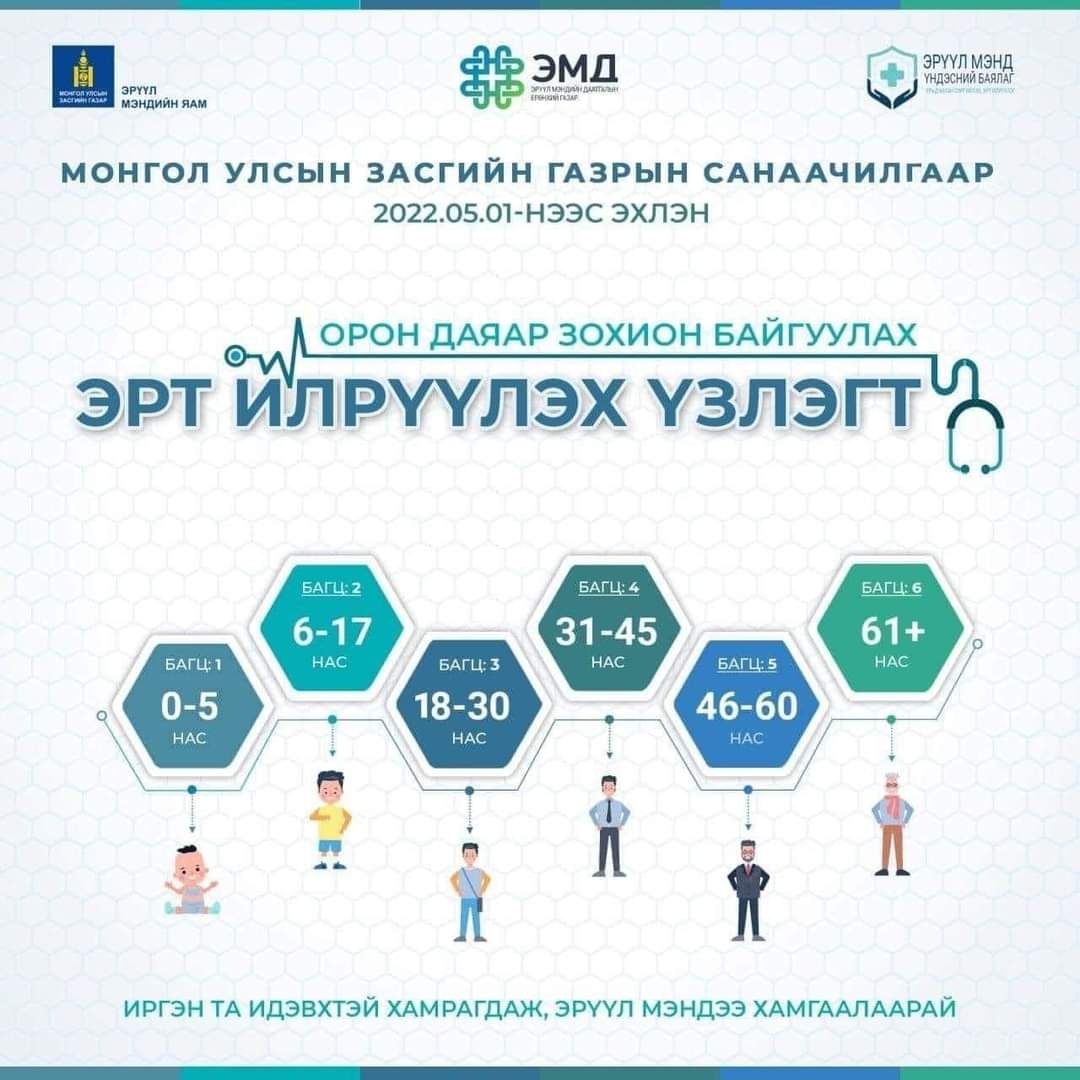 Иргэдийг нийт зургаан насны бүлгээр ангилан тохирох үзэлэг, шинжилгээнд хамруулах бөгөөд шат шатны эмнэлэгт үзлэг шинжилгээг хийнэ.